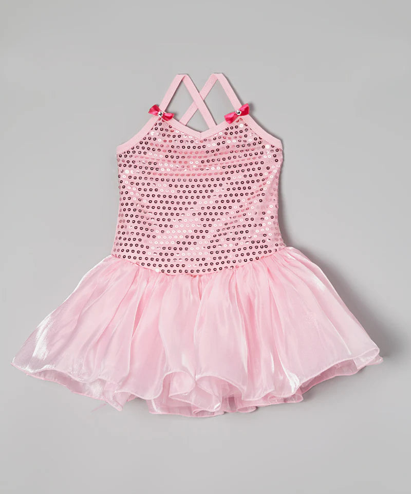 Twirl and shimmer in this enchanting pink sequin dress designed for young dancers! The shimmering sequin front catches the light with every movement, while delicate camisole straps crisscross elegantly across the back for a graceful silhouette. Perfect for recitals, performances, or special occasions, this dress combines sparkle with comfort. Watch your little dancer's confidence shine as bright as the sequins!